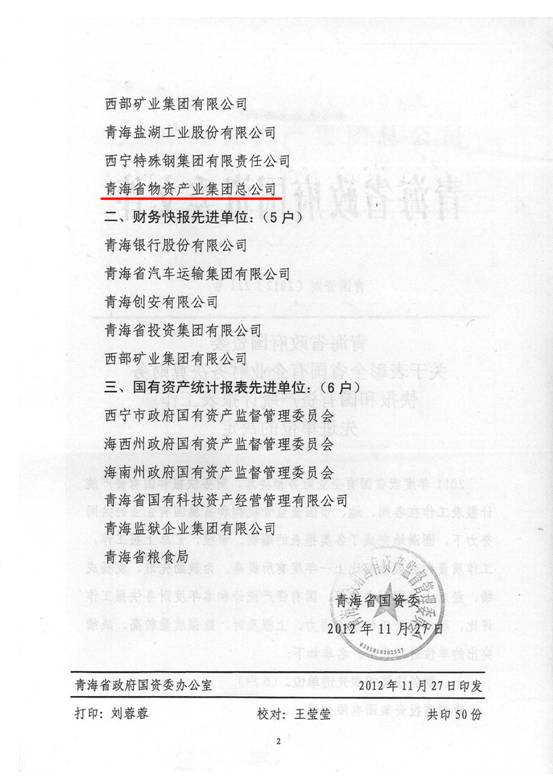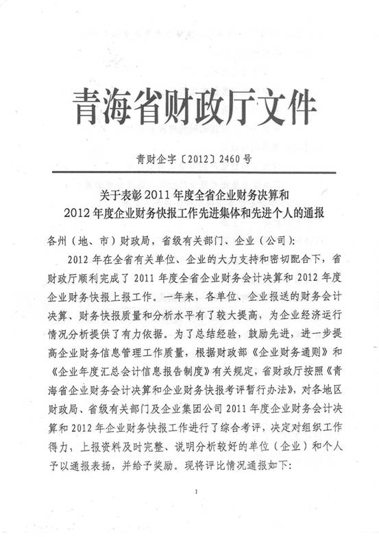 2012年,在集團及所屬各公司領導的高度重視下,在所屬各公司的大力支持和密切配合下,在辛勤工作在財務會計崗位上的同事們的共同努力下,集團總公司圓滿完成了省國資委和省財政廳各類報表的上報工作,財務信息工作質量、時效性和財務分析水平都比上一年度有所提高,受到了省國資委和省財政廳的好評,集團總公司2011年度財務決算工作被省國資委評為先進單位,集團財務審計部張莉青同志被省財政廳評為2012年度財務快報工作先進個人。