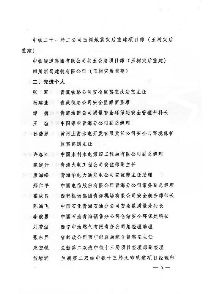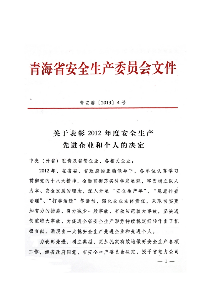 2012年,在省委、省政府的正確領導下,青海省物產集團總公司認真學習貫徹黨的十八大精神,全面貫徹落實科學發展觀,牢固樹立以人為本、安全發展的理念,深入開展"安全生產年"、"隱患排查治理"、"打非治違"等活動,為促進全省安全生產形勢持續穩定好轉做出了積極貢獻。為此,經省政府同意,省安全生產委員會決定授予青海省物產集團總公司"2012年度安全生產先進企業"榮譽稱號。